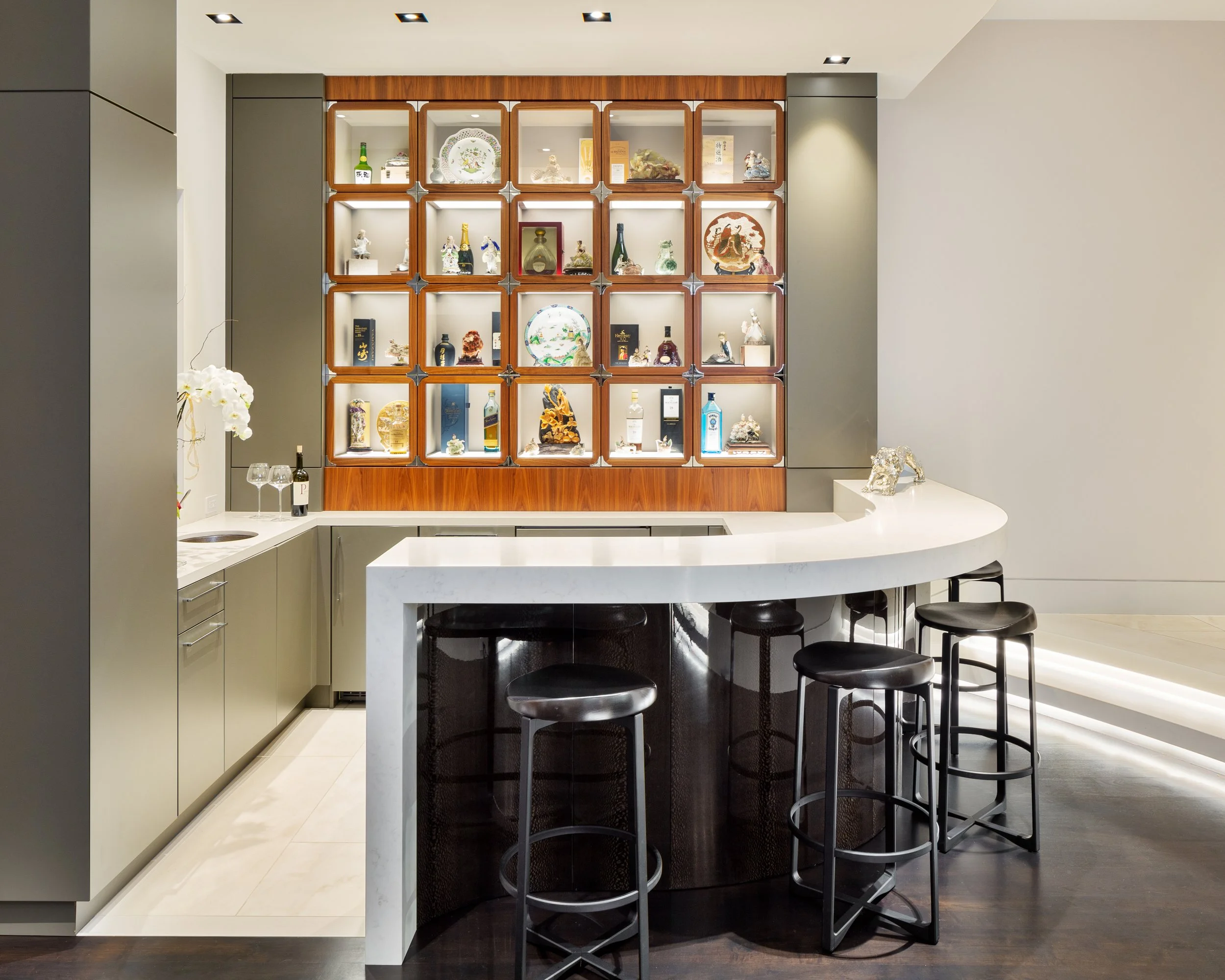 Modern bar area with a white curved countertop, four black bar stools, and a wooden display shelf showcasing various decorative items and bottles. There are two wine glasses and a wine bottle on the counter, with a white orchid nearby.