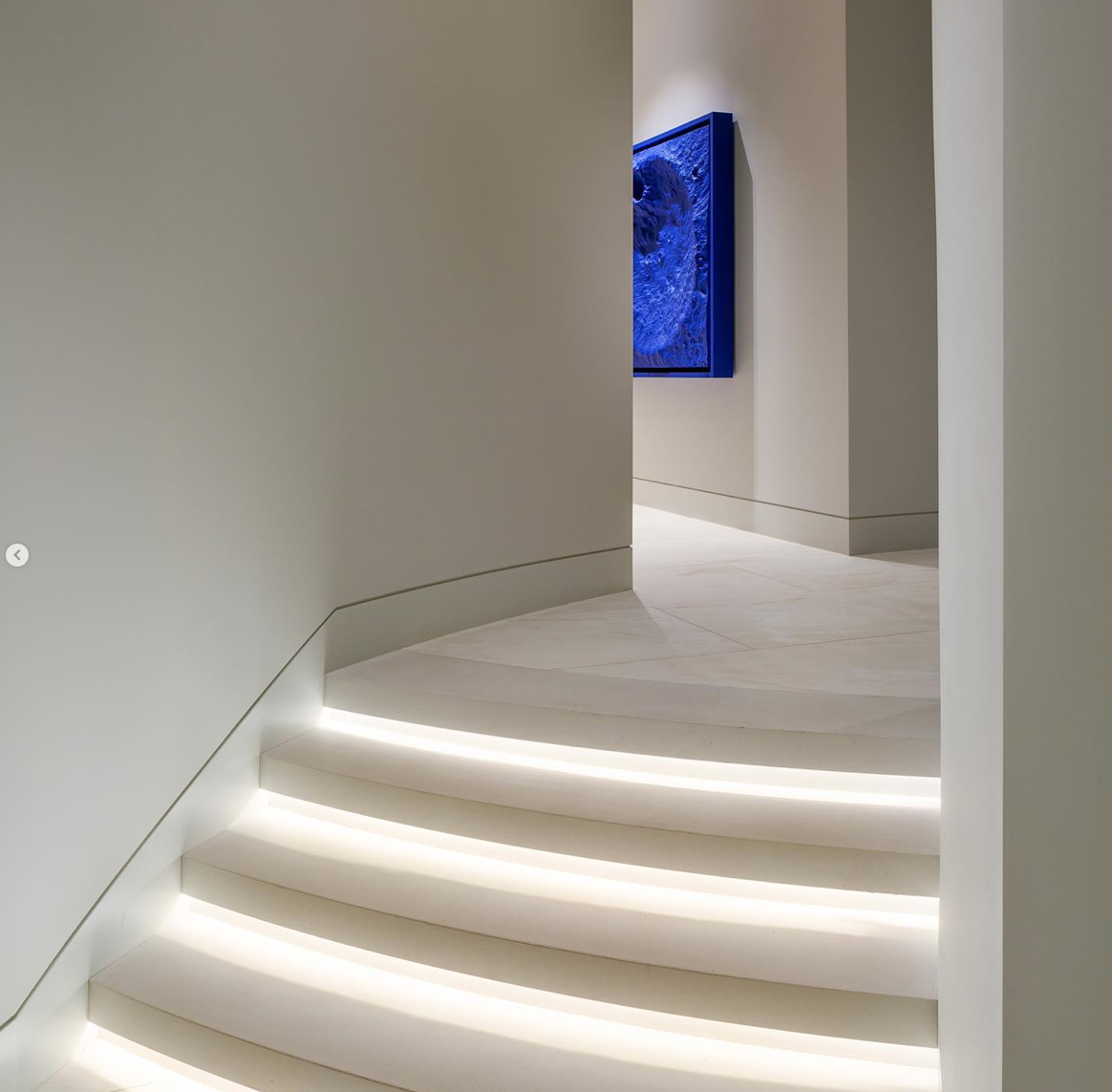 White curved staircase leading to an art gallery with a blue artwork on the wall.