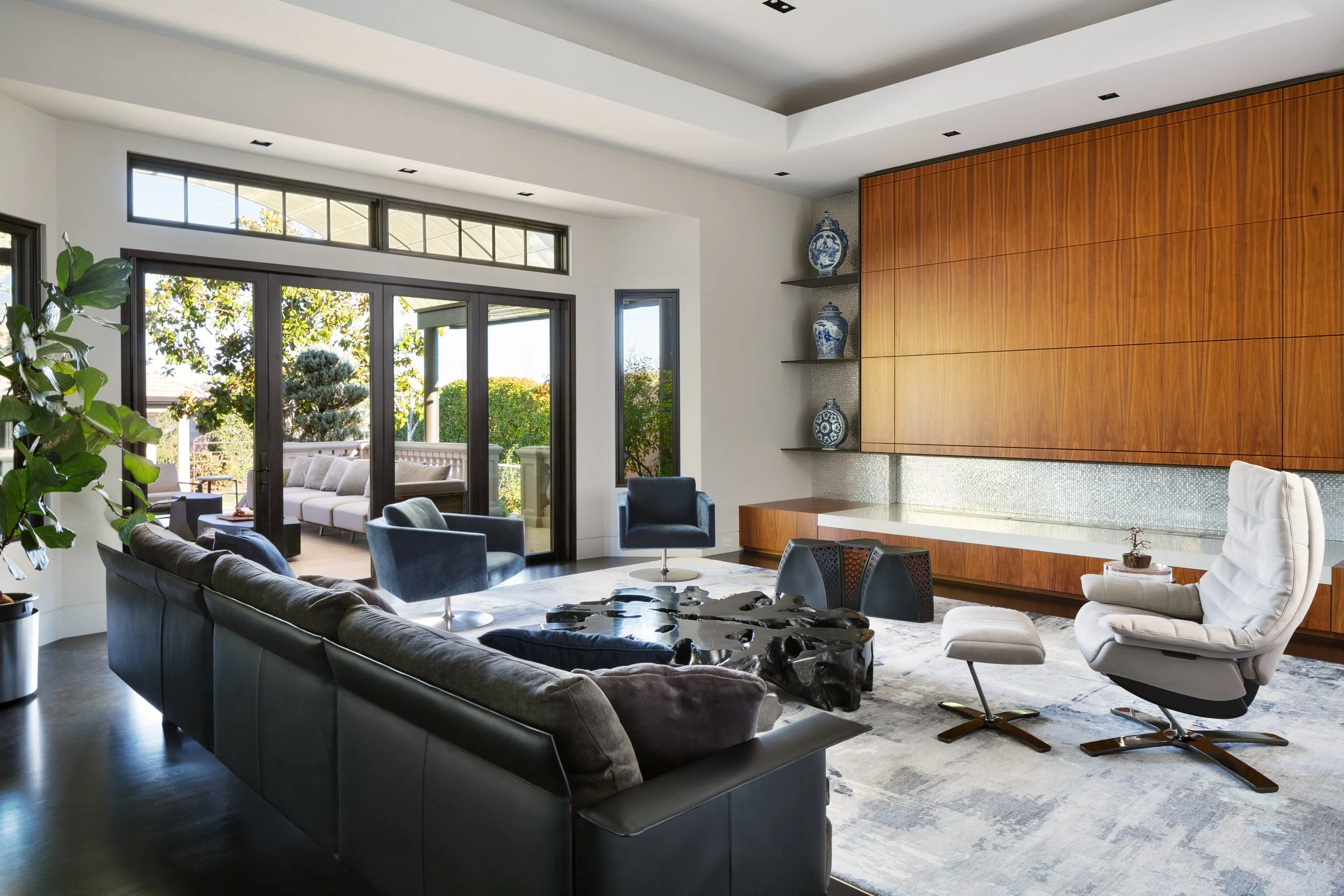 Living room with large windows, leather sofa, modern armchairs, and a wood-paneled wall with decorative blue and white vases on shelves.