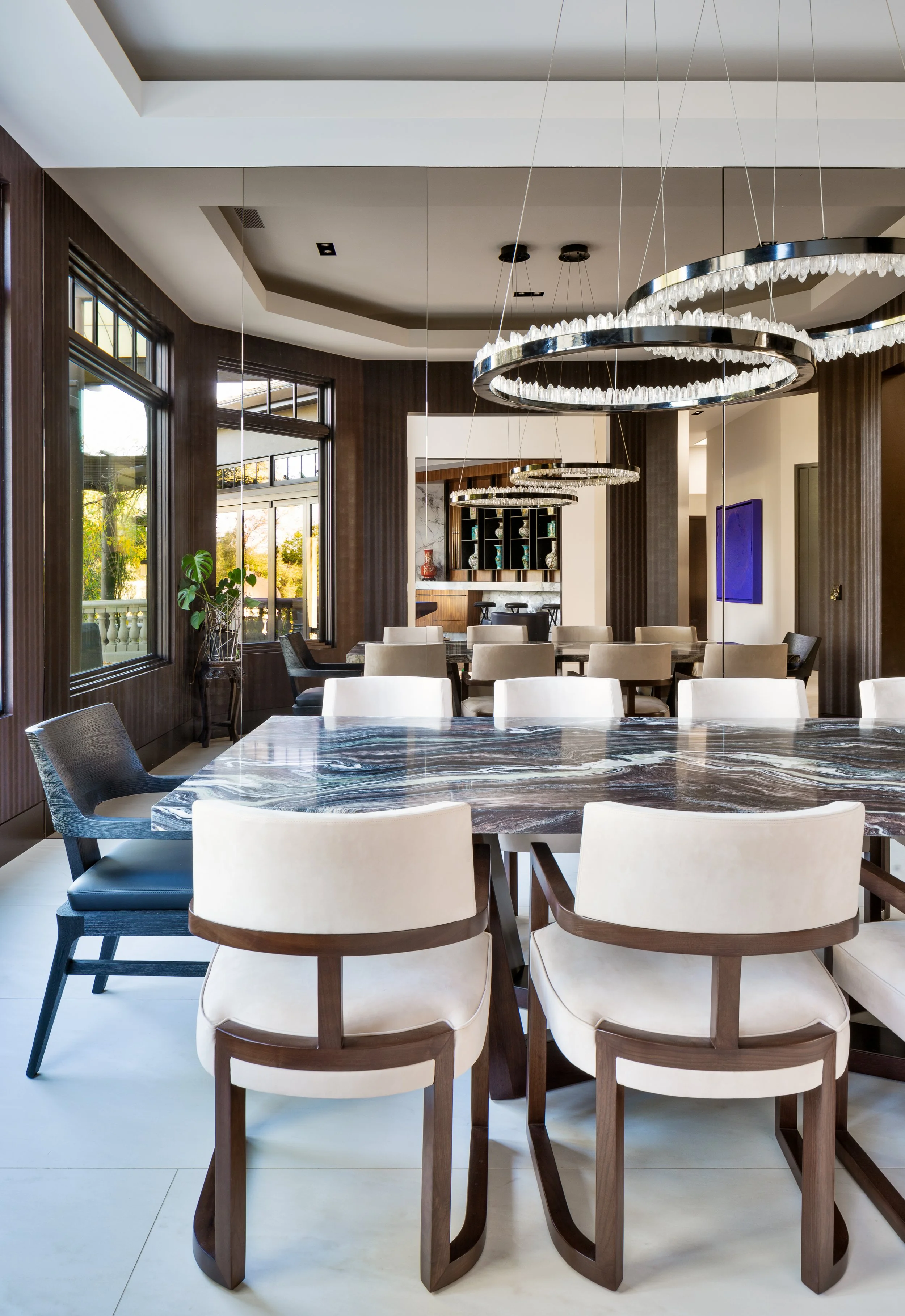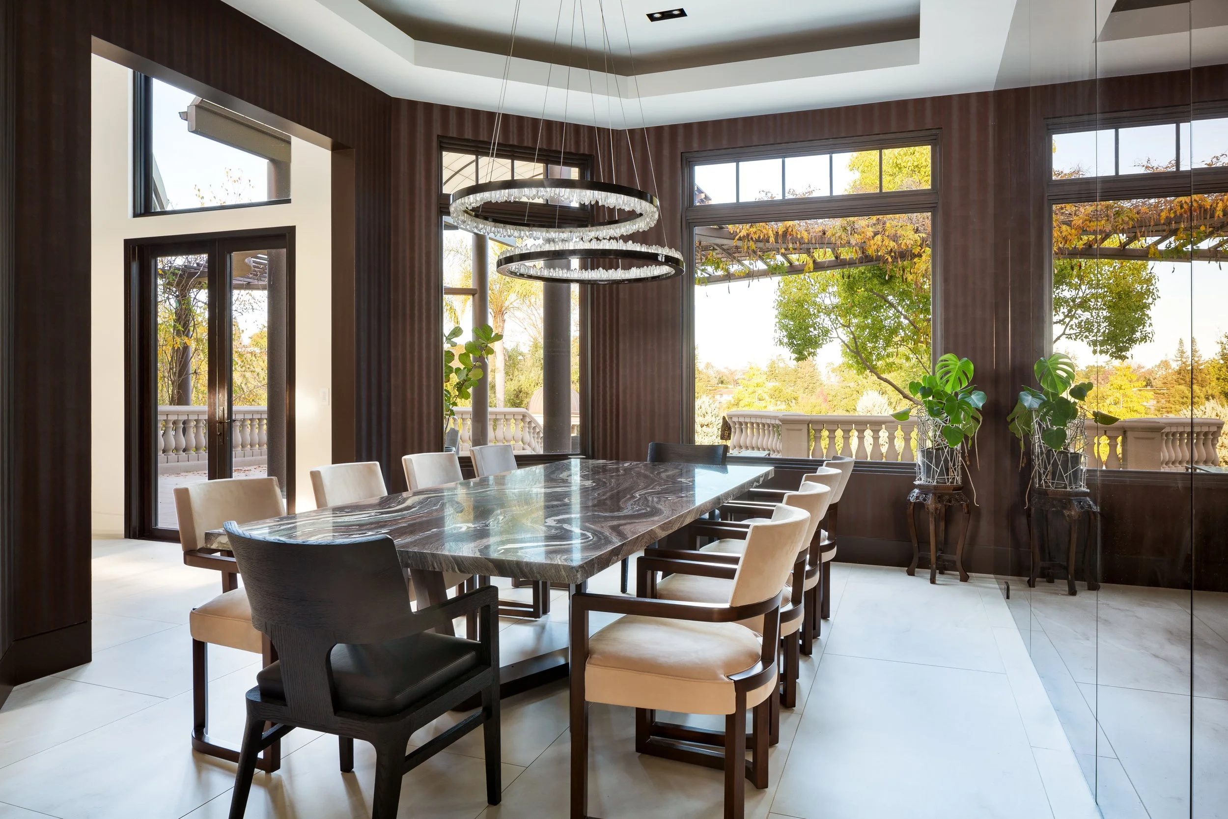 Contemporary dining room with a large marble-top table and modern chairs, pendant lighting fixtures, and large windows showing outdoor scenery.